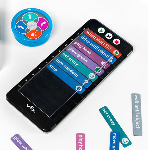 VEX 123 with multiple programming methods (button pressing; coder and coder card; block-based programming)